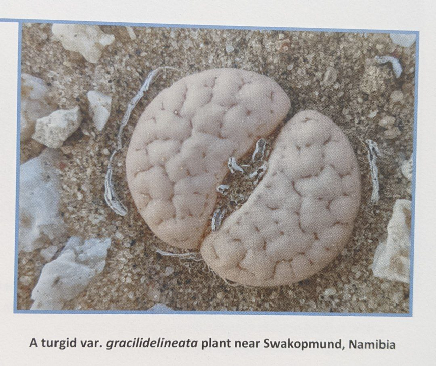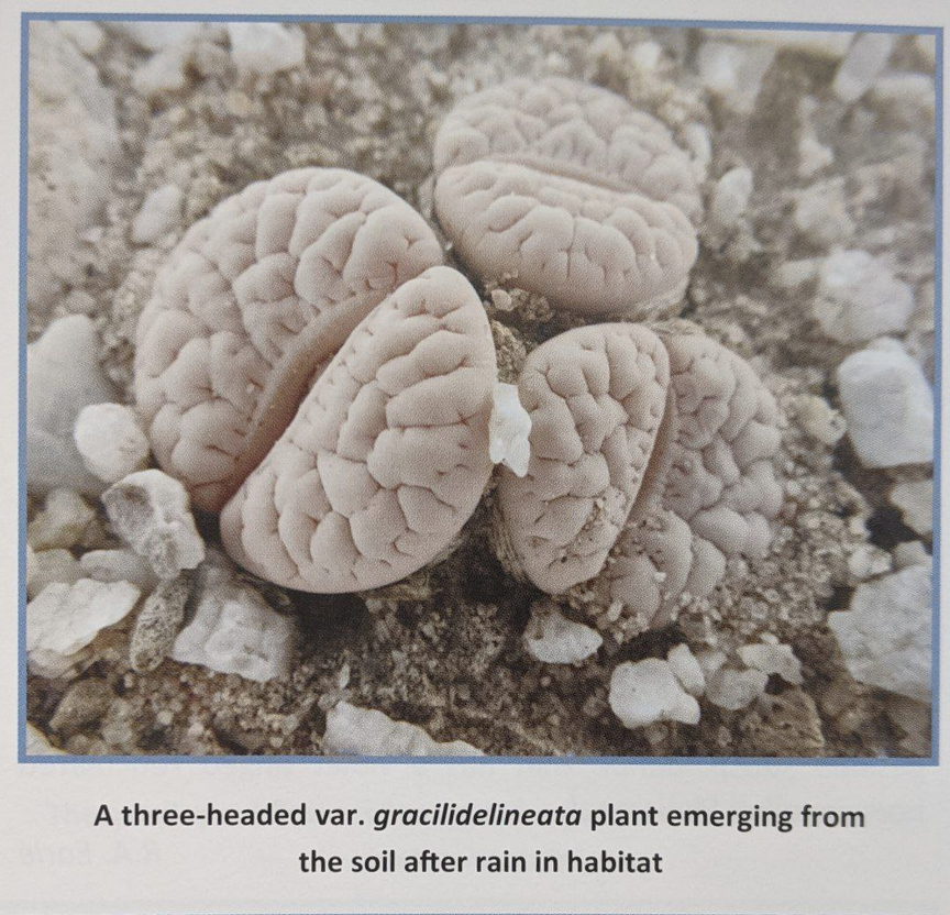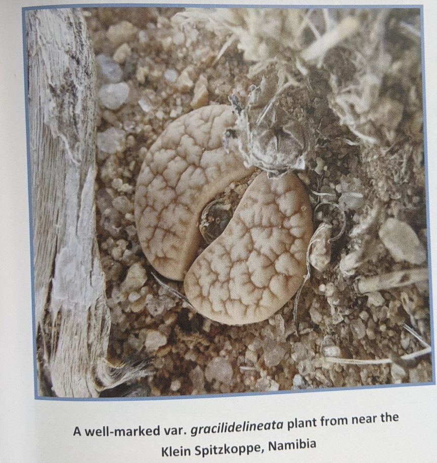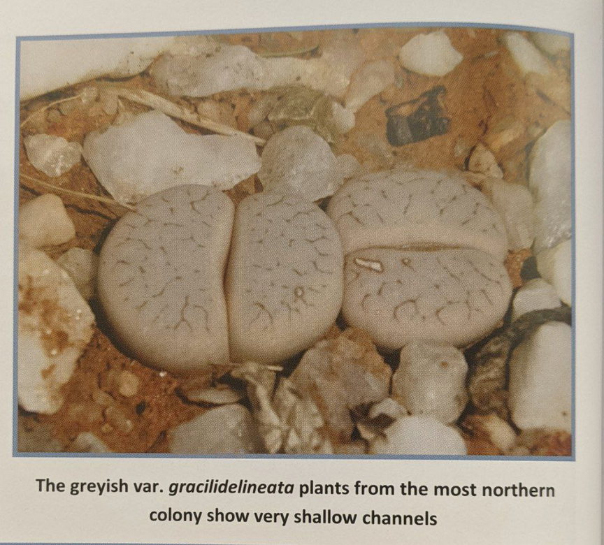 Lithops gracilidelineata, пожалуй, самое популярное растение у энтузиастов среди «не культиваров». Из-за тонких линий и часто глубоких углублений на лицевой поверхности листьев, особенно у var. waldroniae, этот вид часто занимает первую строчку во многих списках желаний. К сожалению, преимущественно одноголовая форма не делает его популярным на выставках. Хотя большинство растений имеют общий серый цвет, а привлекательный подвид brandbergensis — один из самых ярких литопсов, пользующийся даже большим спросом, чем subsp. gracilidelineata.