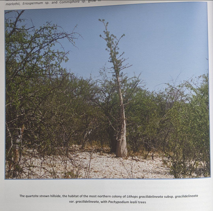 Распространение и среда обитания: Эта разновидность встречается в Намибии на полосе шириной 60–120 км от примерно 50 км к востоку от Свакопмунда к северу на протяжении примерно 100 км, с несколькими колониями недалеко от Шпицкоппе и изолированной колонией к югу от Франсфонтейна. В настоящее время известно около 30 колоний, хотя эта разновидность распространена в виде большой, фрагментированной, но непрерывной колонии на большей части своего ареала, и многие из упомянутых «колоний», вероятно, являются лишь фрагментами одной более крупной колонии. Разные колонии растут на различных светлых гравиях, таких как кварцит, пегматит и полевой шпат. pH почвы неизвестен. В некоторых колониях var. gracilidelineata встречаются растения: Aloidendron dichotomum, Monsonia marlothii, Stapelia schinzii, Ledebouria revoluta, Portulacacollina, Larryleachia marlothii, Eriospermum sp. и Commiphora sp. Множество растений Welwitschia mirabilis обнаруживаются вблизи как минимум двух других колоний. Место произрастания самой северной колонии var. gracilidelineata к югу от Франсфонтейна (Намибия), на усыпанном кварцитом холме также является средой обитания многих деревьев Pachypodium lealii.